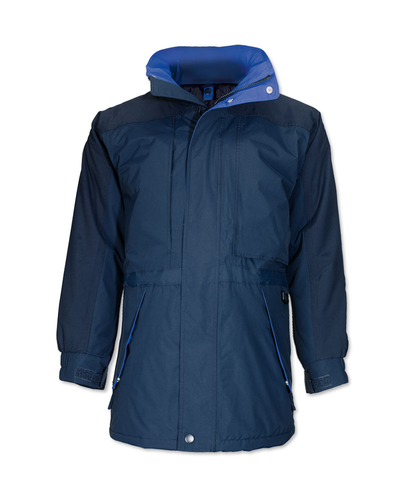 ParkaTunnel collar to shield from rain without restricting visibilityFleece paddingFull zip front with Velcro storm flapTwo external zipped pockets and one internal pocketHidden hood100% nylon outer. 100% polyester inner40 degree washSize guide V