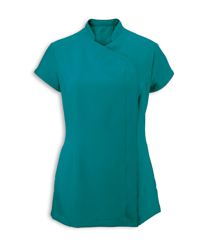 Mandarin style stand collarAsymmetrical front with zip and three concealed stud fastening Two concealed side seam pocketsSingle action back for ease of movementSide vents200gsm 100% stretch soft-touch polyesterUp to 40 deg washSizes 6 – 26Back length 72 – 78cm (increases with sizes)For co-ordinating slim leg trousers see NF75