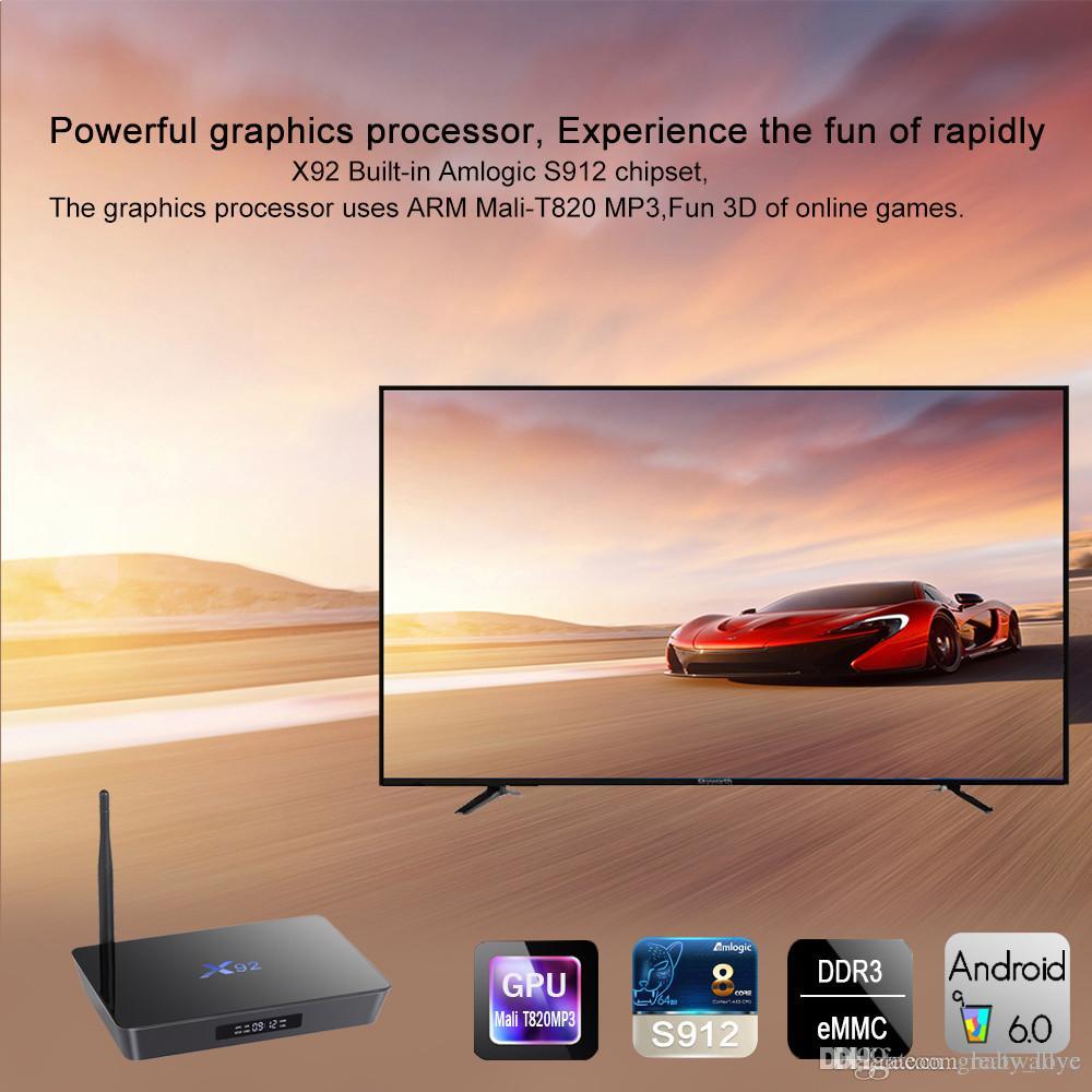 1.Amlogic S912 64 bit Octa core ARM Cortex-A53 CPU up to 2 GHz 2.GPU: Mali-T820MP3 @ 750MHz 3.DDRIII 2GB/3GB, eMMC Flash 16GB