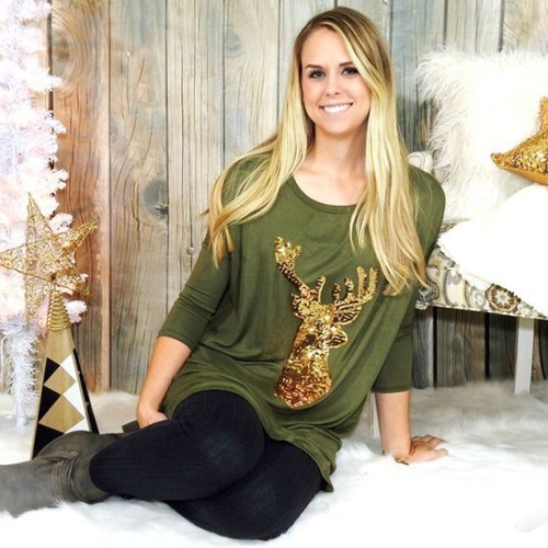 Autumn Winter Women Blouse Long Sleeves Sparkling Sequin Deer Casual Loose Christmas Top Pullover