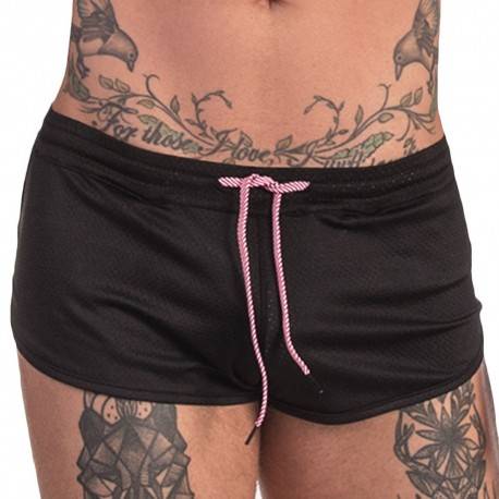 Very sexy short made from unlined soft mesh. Short cut with side notch. Inner mesh pouch for a great support and comfort. Back pocket with Barcode label. Elastic waistband with drawstring.