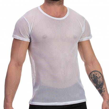 Very sexy t-shirt made from see-through net mesh. Slim flattering cut to highlight your muscle. Short sleeves and round collar. Barcode label sewn on the upper back.