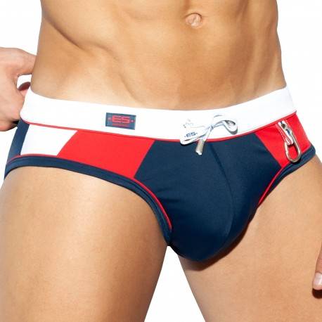 Colorblock swim brief made from resistant and comfortable microfiber. Removable Pack Up foam system to enhance your masculinity. Sporty low-rise cut. Elastic waistband with ES Collection drawstring and silicone logo. Carabiner on the front.