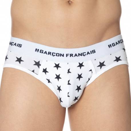 Fitted, soft, flexible and comfortable low-rise brief. Original star print. Beautiful Garçon Français waistband and contrasting trims. 100% made in France.