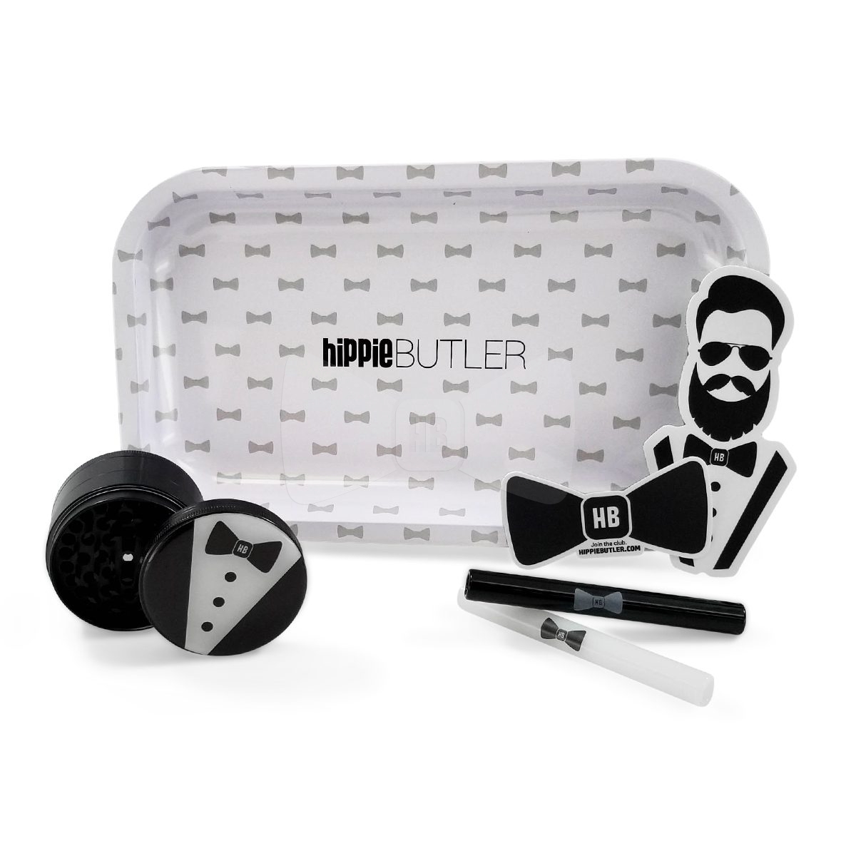 Keep it classy and elegant with this Hippie Butler Bundle. Everything included in this monochrome, Hippie Butler themed bundle is perfect for a beginner or for the veteran connoisseur to add to their ever-growing collection. Each item showcases your Butlers iconic bowtie logo and is made of long-lasting, durable materials.  First, we started with a large rolling tray, and added a large 4 piece 50mm grinder with a magnetic closure.  Then we included not one, but two glass bat chillums and a couple of butler stickers so you can be sure to show off your butler pride wherever you go.  So go ahead and grab up this Butler-approved bundle today! Items in this bundle : Hippie Butler Grinder Hippie Butler Bow Tie Tray Hippie Butler Bat Chillum   x2  (Black and White) Hippie Butler Bowtie Sticker   x1 Hippie Butler Butler Sticker   x1