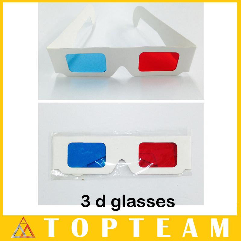 3D glasses 1 lot = 100pcs Color: white frame with blue and red lens Weight: 5g/pcs Material: PET Size: 40.5 *3.7cm Customization: ok Packaging: OPP bag