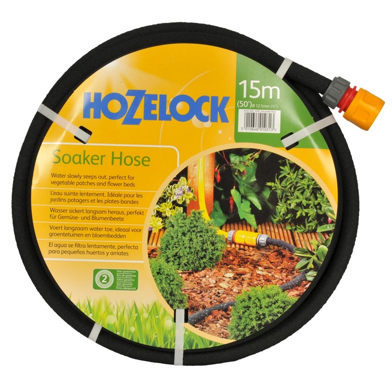 The Hozelock Soaker Hose is a porous 12.5mm hose ideal for watering beds and borders without waste. The porous hoze is designed so that water seeps gently which is ideal for establishing young plants and hedges. This is the 15m kit.
