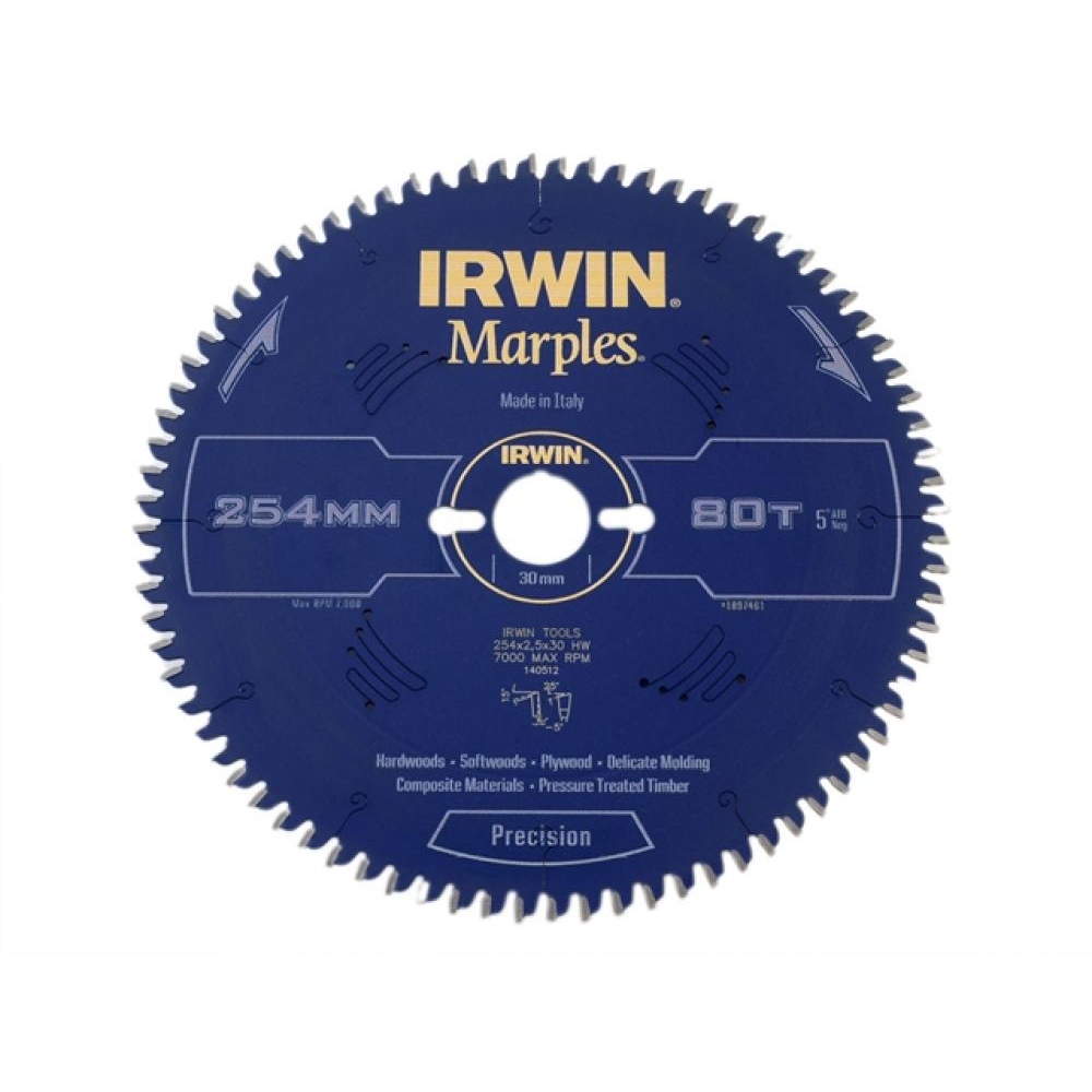 The Irwin Marples Circular Saw Blades are made from carbide which is larger and tougher than standard carbide for up to 3 times longer life. The teeth can also be re-sharpened. The body of the blade is laser cut to ensure a more straight and clean cut. Precision tensioning provides greater accuracy. The blades have a special coating with aluminium flakes that help to dissipate heat for smooth, cool cuts. The Alternate Top Bevel tooth grind (ATB) is ideal for cross-cutting and ripping in all woods.The IRWIN Marples IRW1897461 Circular Saw Blade has the following specifications:Diameter: 254mm.Bore: 30mm.Teeth: 80.