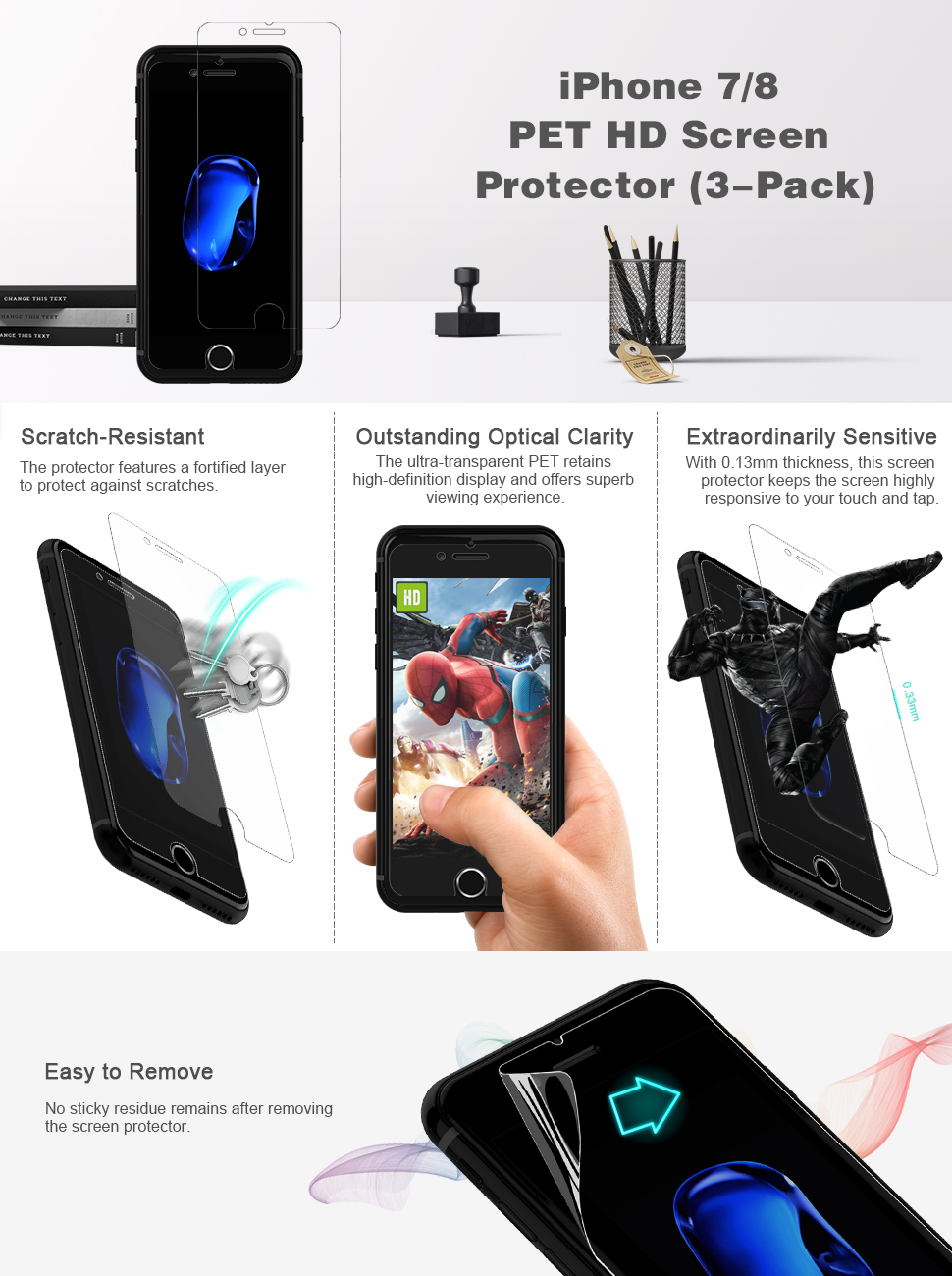 ● NOTE: Due to the round edge of iPhone 8 and 7, the screen protector will NOT cover the full screen, but only the flat area● Precision cut to specifically fit the Apple iPhone 7 and 8 4.7″. High quality PET, High Definition, Hassle-free, bubble-free installation● Dust-free and fingerprint-free● Long lasting protection against scratches. No sticky residue when removed● Retail package includes: 3-Pack PET screen protector, cleaning cloth, dust removal stick, guide stick, instructions, squeegee, life-time warranty card