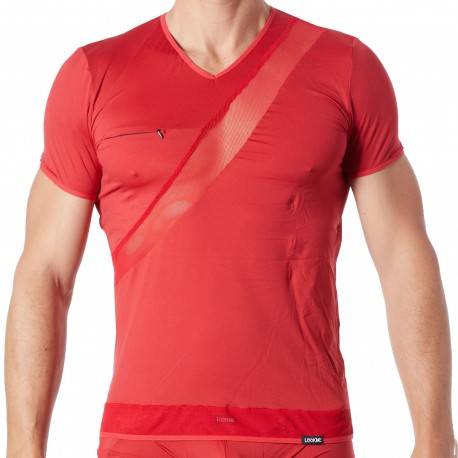 Sexy t-shirt made from soft, lightweight and comfortable microfiber. See-through mesh inserts claw the torso and the back. Fitted cut with short sleeves and V-neck. Zipper on the left chest.