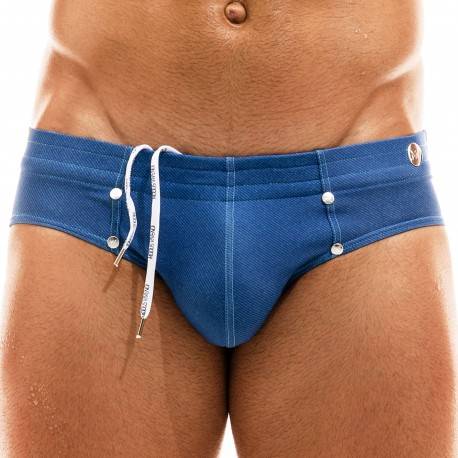 Low-rise swim brief made from soft and resistant microfiber with a denim aspect. Very fitted sexy cut. Lined shaped pouch. Elastic waistband with inner drawstring. Modus Vivendi metallic snaps. Made in Greece.
