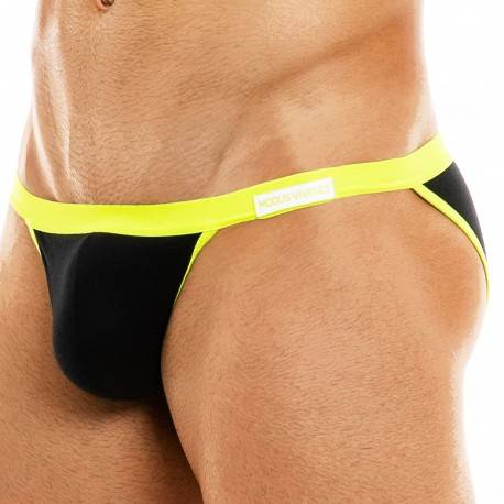 Slightly transparent brief made from ultra thin and lightweight microfiber in vivid color. Super low-rise tanga cut. Neon detailing. Thin elastic waistband with Modus Vivendi label.