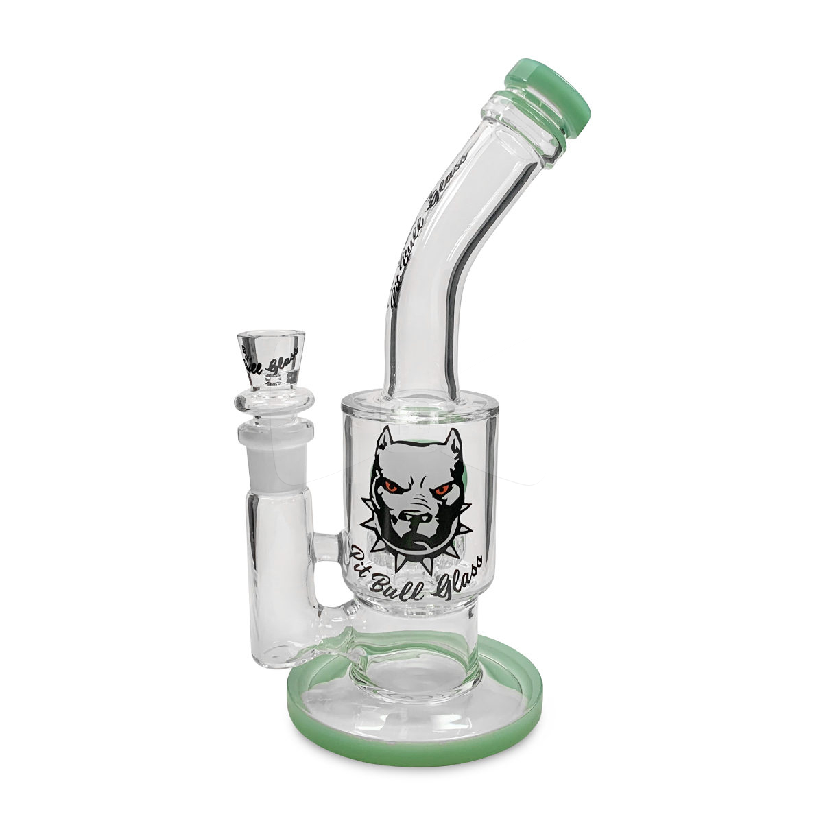 Simplicity can be beautiful and this Pit Bull 10″ Bent Neck with Knob glass accent proves it. Each of these branded glass pieces features a showerhead perc that thoroughly breaks up, cools and filters your smoke and creates a shower of bubbles inside the glass piece. Each perc is adorned with a large glass “knob” accent that matches the mouthpiece for added style and flair. The bent kneck is ideal for taking comfortable draws and as well as showcasing the Pit Bull brand. This simple yet effective piece would make the perfect starter glass for the new smoker or a great addition to the seasoned connoisseurs collection. This glass piece has a 18mm female joint that will fit 18mm male accessories and replacements.