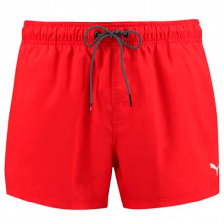 Solid swim short made from recycled stretch microfiber with quick-drying capability. 2 side pockets and 1 back pocket with Velcro closure. Puma logo on the left thigh. Elastic waistband with contrast drawstring.