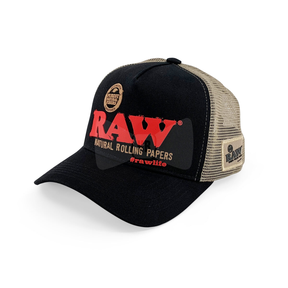 Add this black and tan RAWLife Brazil Trucker Hat to your ensemble and showcase your high brow choice in rolling papers. These mesh back hats showcase the iconic red RAW logo stamped across the front and are the perfect accessory to any outfit. The back is fully adjustable and your fresh roll in the side holder completes this RAWsome accessory.