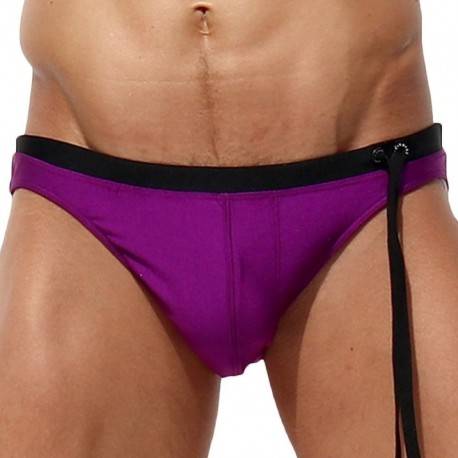 Low-rise swim brief made from lightweight and comfortable microfiber. Very fitted cut. Front lining. Contrast elastic waistband with off-center drawstring. Back stitching to enhance your buttocks. Fake fly. Made in California.