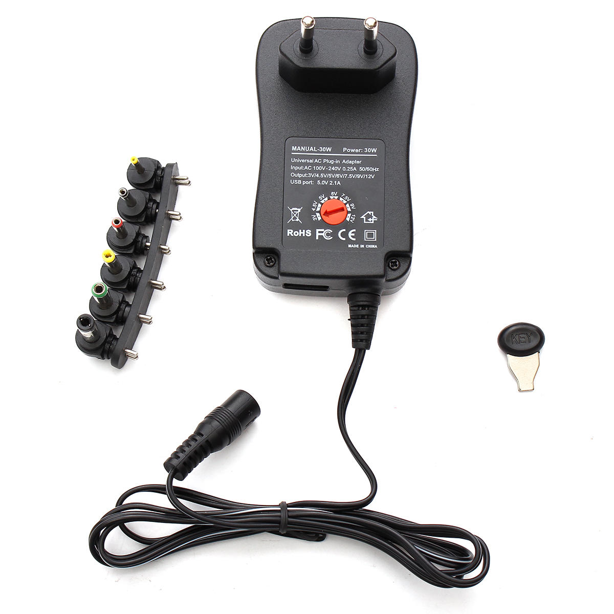 Description:The device, classic black in colour, allows you to use almost any electronic devices anywhere in the world via its included 6 plugs and a choice of 6 DC Plugs ((2.5×0.7mm 3.0×1.1mm 3.5×13.5mm 4.0×1.7mm 5.0×2.1mm 5.5×2.5mm)).Simply attach the DC plug which fits the specific device and power up. Furthermore, you can easily change the plug by pulling it out and inserting another, so you can power different devices with this one power supply.It boasts a low power consumption with input voltages of 100 – 240V, 50 Hz/60Hz and it has an impressive powerful maximum of 1000 mA over all the voltage ranges. Furthermore, it is importantly a very light power supply unit, making it easy to fit and carry in any bag or suitcase and with state-of-the-art technology and high efficiency, you can rely on this device as a power supply for nearly all your electrical devices. Power up today with the great value Uni Switch Mode Power Supply 1000MASpecifications:Product Name: Universal Voltage AdapterDimensions: 85x50x34mmInput: AC 110-240VOutput: 3V, 4.5V, 5V, 6V, 7.5V, 9V, 12VUSB Output: 2.1A/5VPower: 30WPowerful: up to 1000 mA over all voltage rangesDC Tip: 6pcs DC Plugs (2.5×0.7mm 3.0×1.1mm 3.5×13.5mm 4.0×1.7mm 5.0×2.1mm 5.5×2.5mm)Material: ABS+PC+Fireproofing materialProduction: SCP,OVP,OCP,OTPPacked in box: 120x80x50mmPackage Included:1 x Universal Power Supply1 x Rotating Key1 x DC Plug: 2.5×0.7mm1 x DC Plug: 3.0×1.1mm1 x DC Plug: 3.5×13.5mm1 x DC Plug: 4.0×1.7mm1 x DC Plug: 5.0×2.