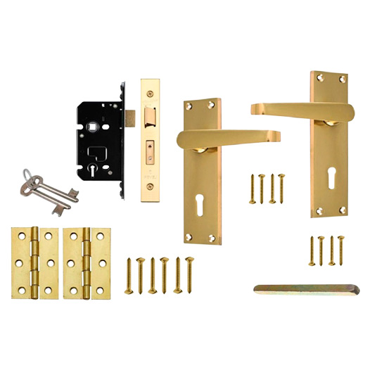 Victorian Style Lock Pack, Pair Brass, 145 x 37mm, 3-Lever, 3 x 100mm Brassed Hinges & Screws