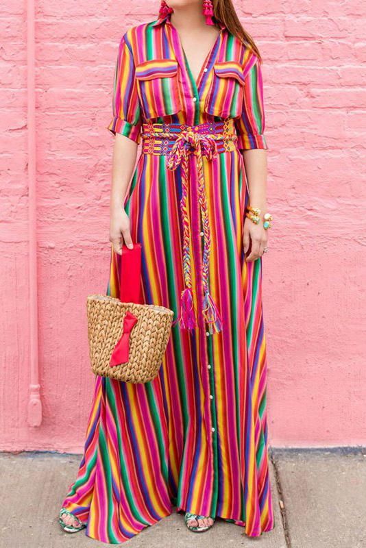 A| Chicloth Shirt Collar Maxi Dress Daytime Short Sleeve Pockets Dress-Cheap Casual Dresses