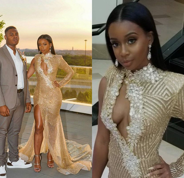 2019 Sexy Gold Evening Dresses High Side Split Sweep Train Bead Crystal Mermaid Prom Dress Party Wear Illusion Special Occasion Gowns